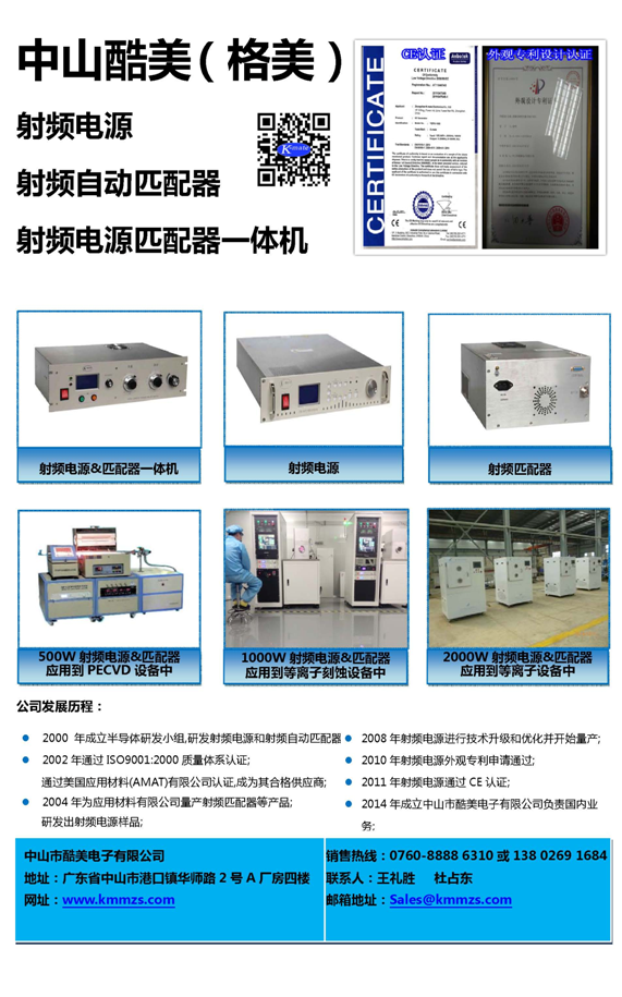 中山市酷美電子有限公司是一家專業(yè)從事半導(dǎo)體制造設(shè)備研發(fā)、設(shè)計和制造的高科技合資企業(yè)。產(chǎn)品主要有射頻電源、射頻自動匹配器、射頻功率分配器,廣泛用于太陽能光伏系統(tǒng)、PECVD、真空鍍鏌、刻蝕等真空設(shè)備當中。公司于2000年進入半導(dǎo)體領(lǐng)域,已有15年豐富的行業(yè)經(jīng)驗。2002年,成為全球最大的半導(dǎo)體設(shè)備制造商AMAT(美國應(yīng)用材料公司APPLIED MATERIALS INC)認證的供應(yīng)商,并為AMAT大批量制造射頻匹配器等產(chǎn)品,每年DMR比率控制在1%之內(nèi)。